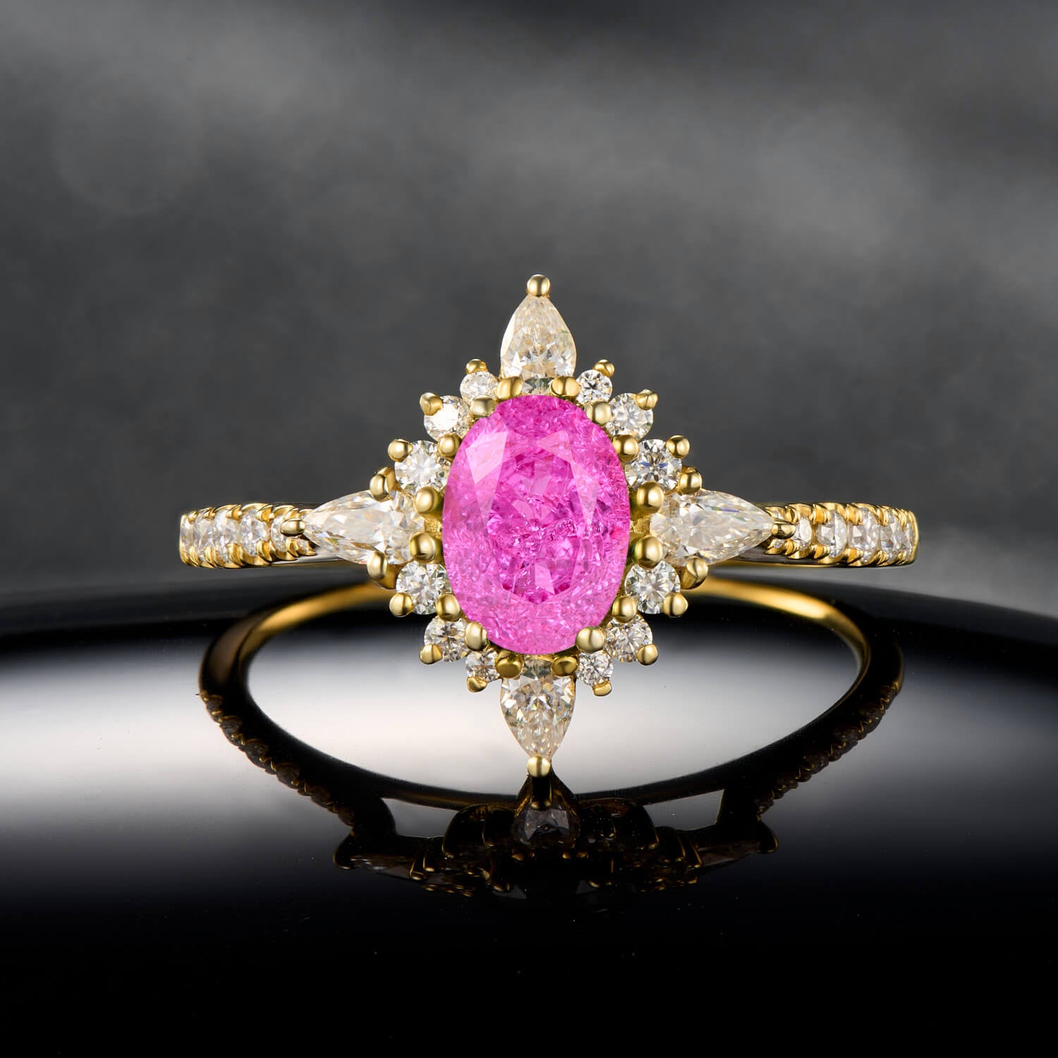Radiant Ice Shard Oval Cut Pink Sapphire Ring in Gold Halo Style Statement Engagement Ring