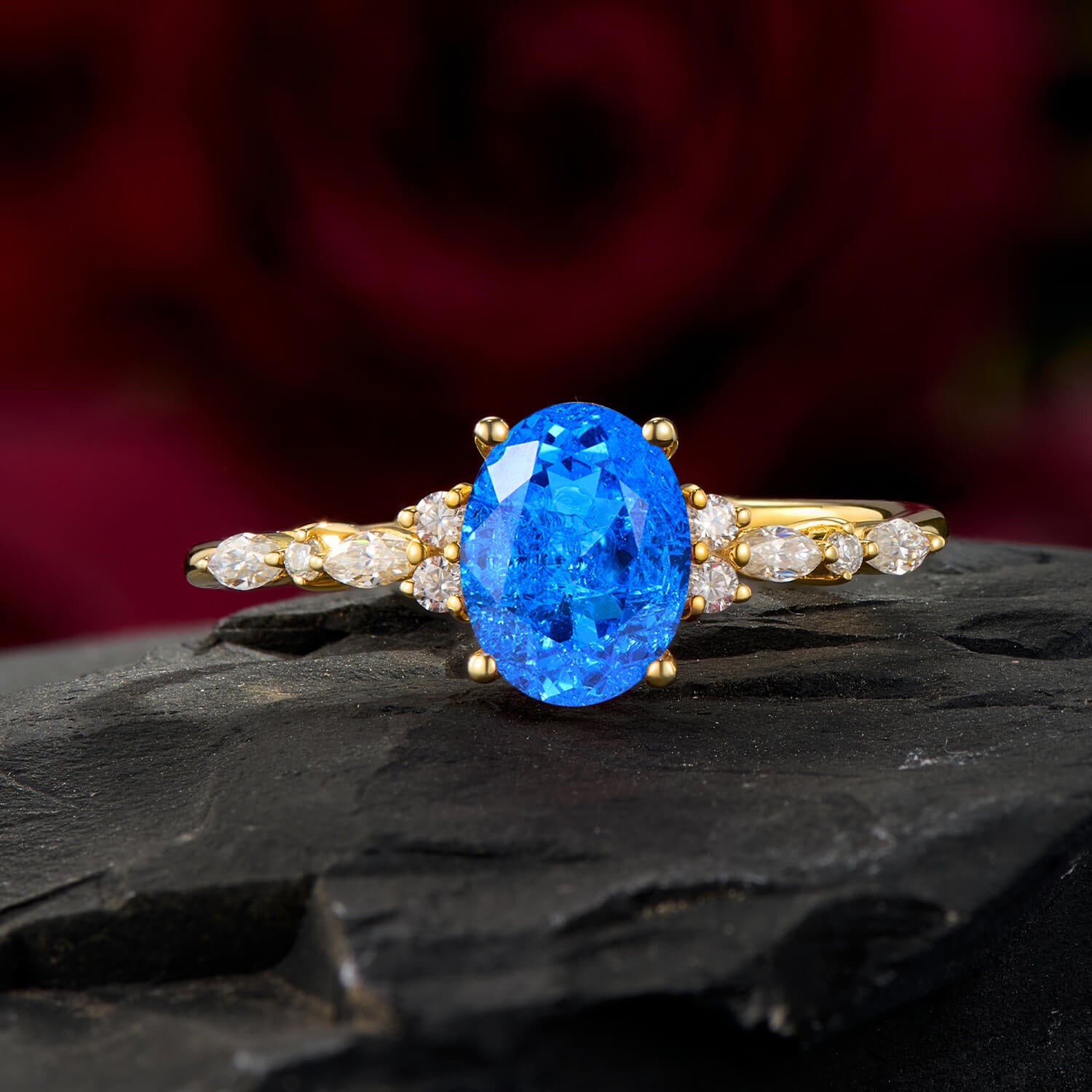 Glacier Spark Oval Cut Crushed Ice Sapphire Solitaire Ring in Gold Vintage Style Statement Engagement Ring