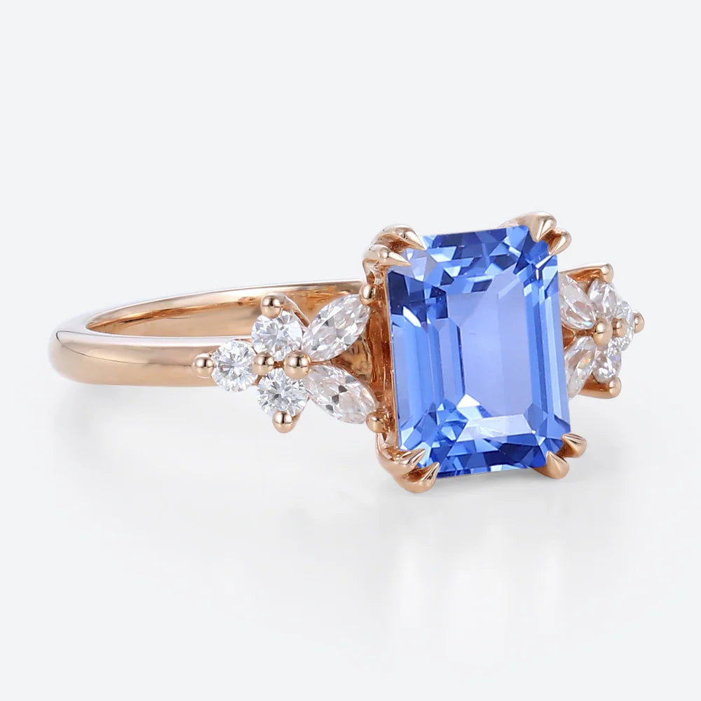 Emerald Cut Cornflower Sapphire Cluster Engagement Ring with Floral Design in Rose Gold