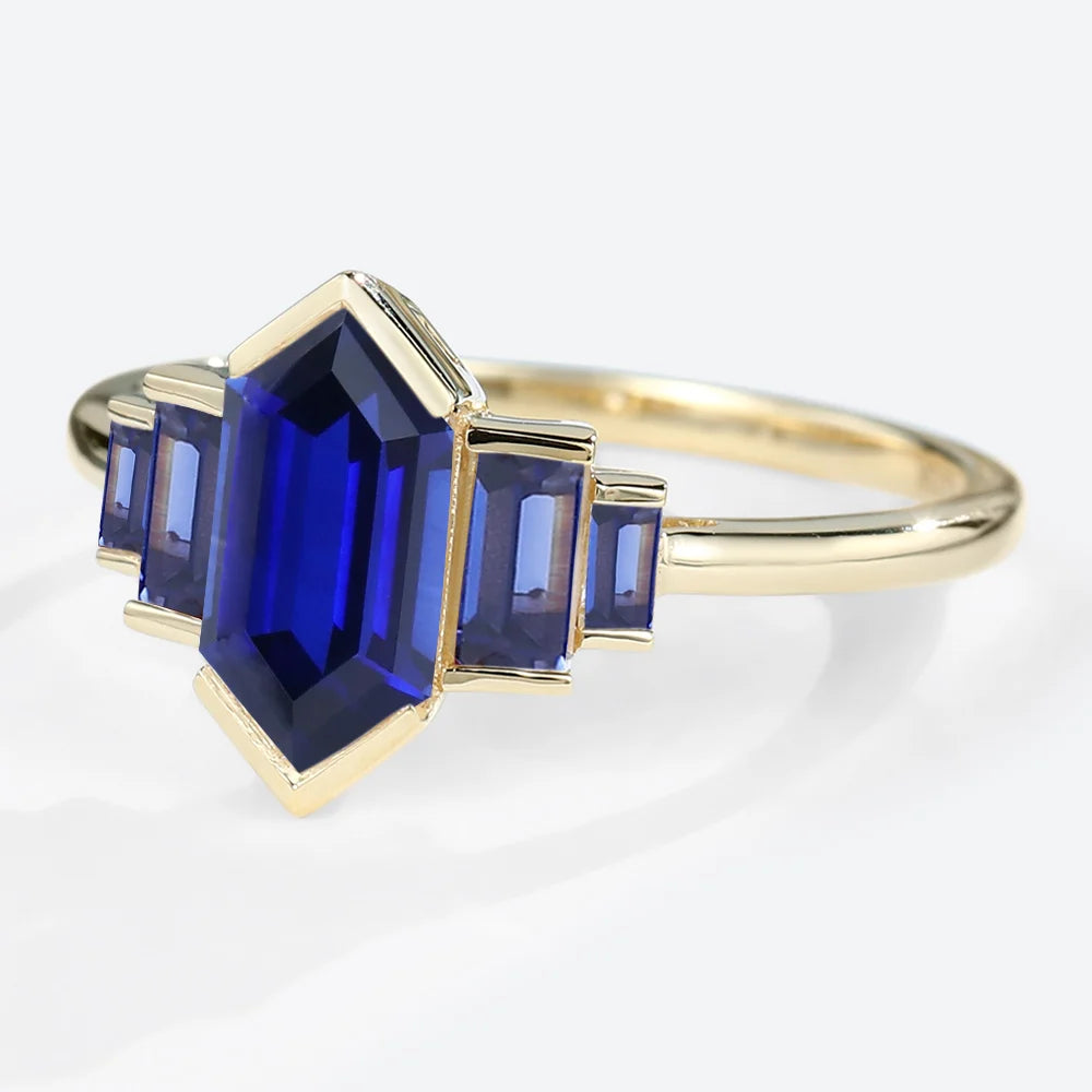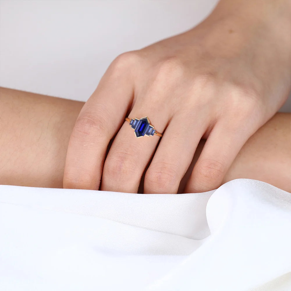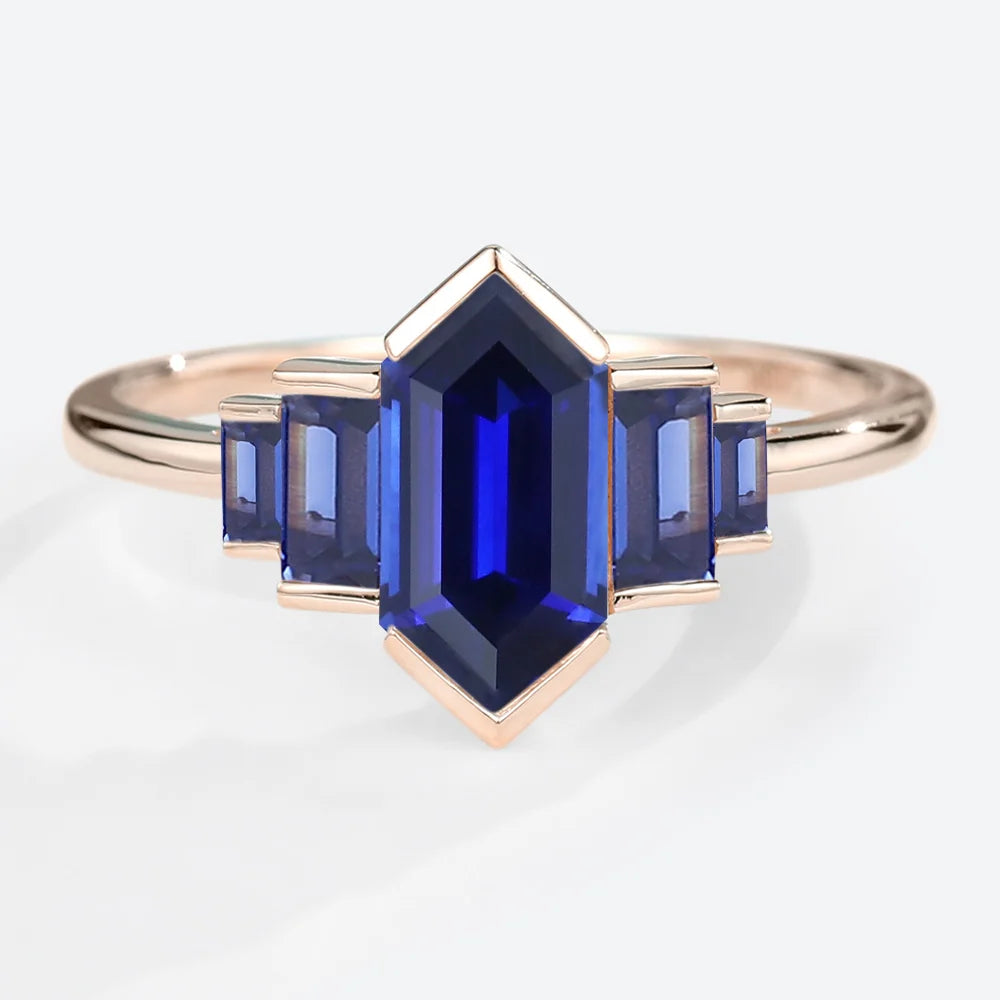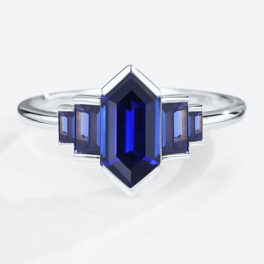 Long Hexagon Cut Lab Sapphire Unique Engagement Ring Eye-Catching Bridal Ring