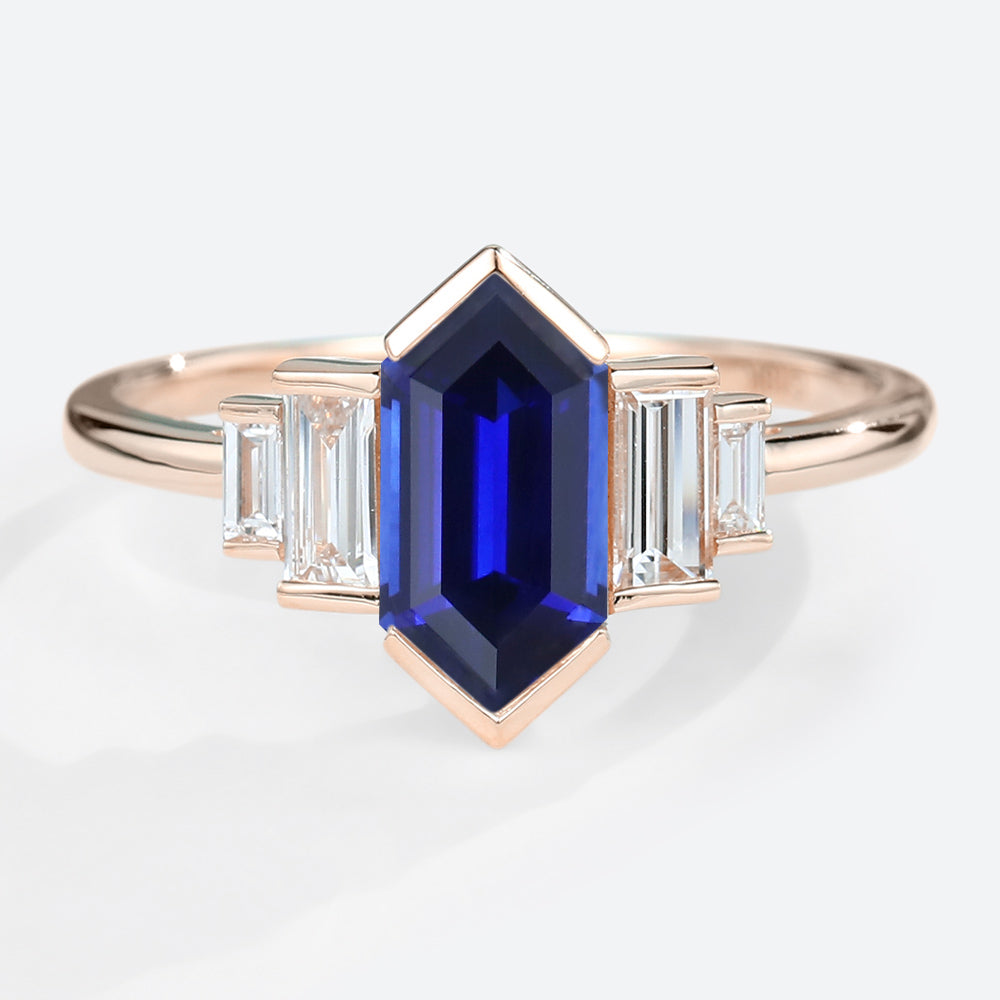 Long Hexagon Cut Lab Sapphire Unique Engagement Ring Baguette Accented Bridal Ring