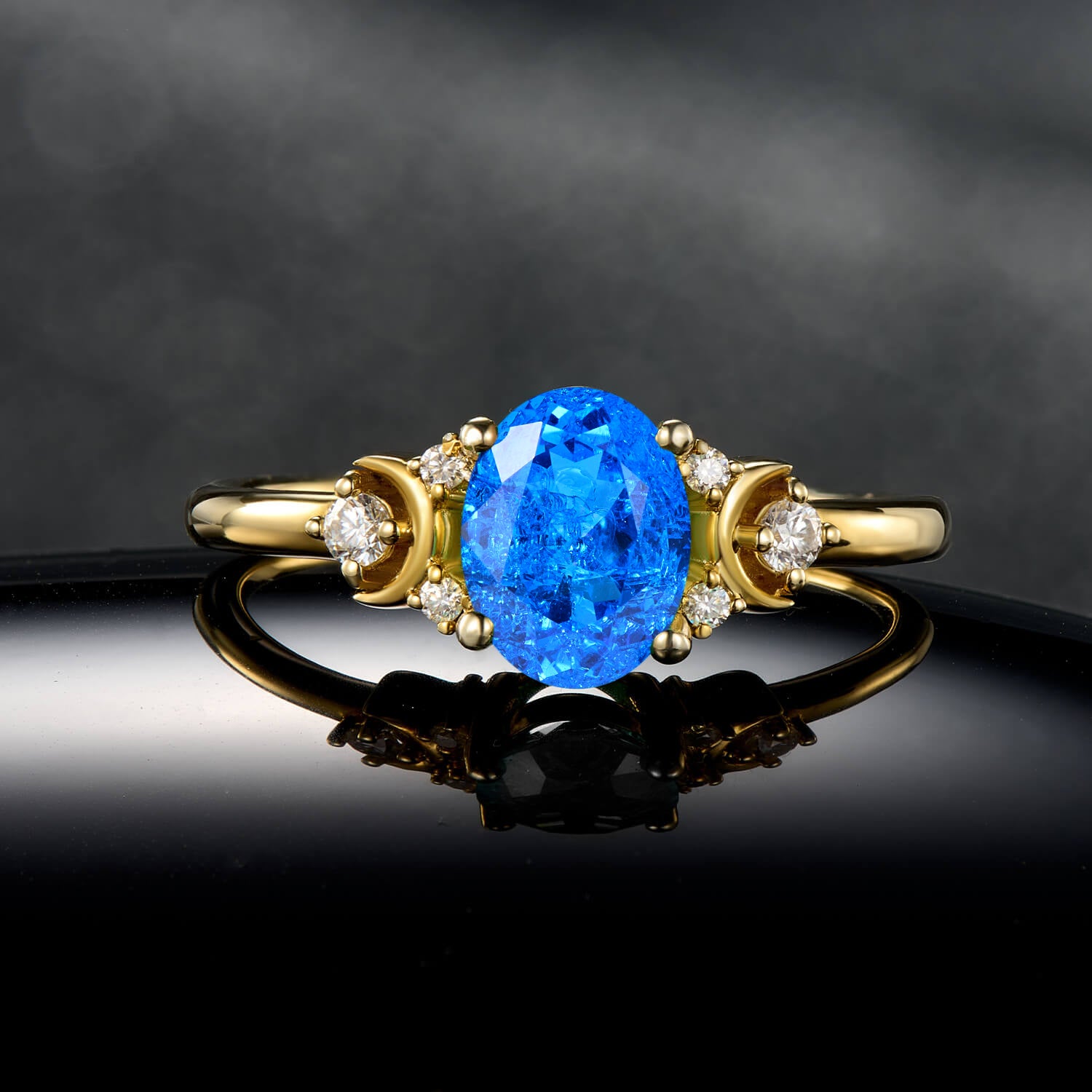 Crescent-inspired side accents and delicately set Moissanite stones amplify the gem’s brilliance, adding depth and subtle shimmer while maintaining a refined, harmonious profile. Every movement brings the crushed ice facets to life, creating a dynamic play of light that is both modern and timeless.