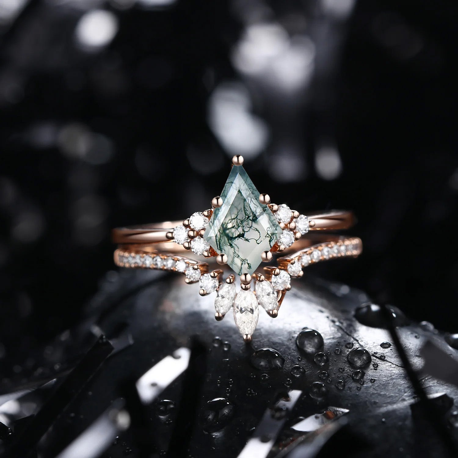 Kite Cut Moss Agate Engagement Ring Set 2pcs - Electra