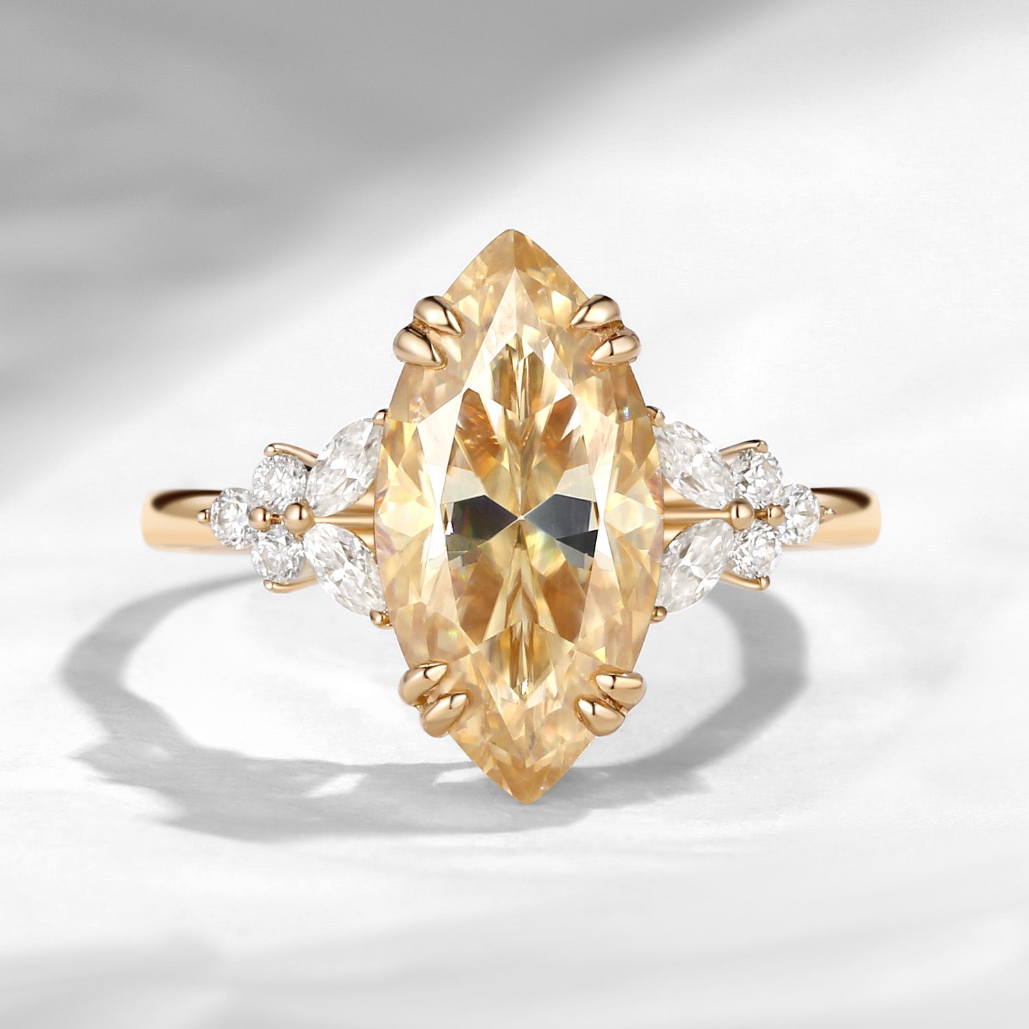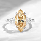 At its center lies a striking marquise-cut yellow moissanite, glowing with rich golden hues that symbolize joy, prosperity, and enduring love. The elongated cut enhances brilliance and fire, allowing light to reflect beautifully across every facet while flattering the finger with its elegant proportions.