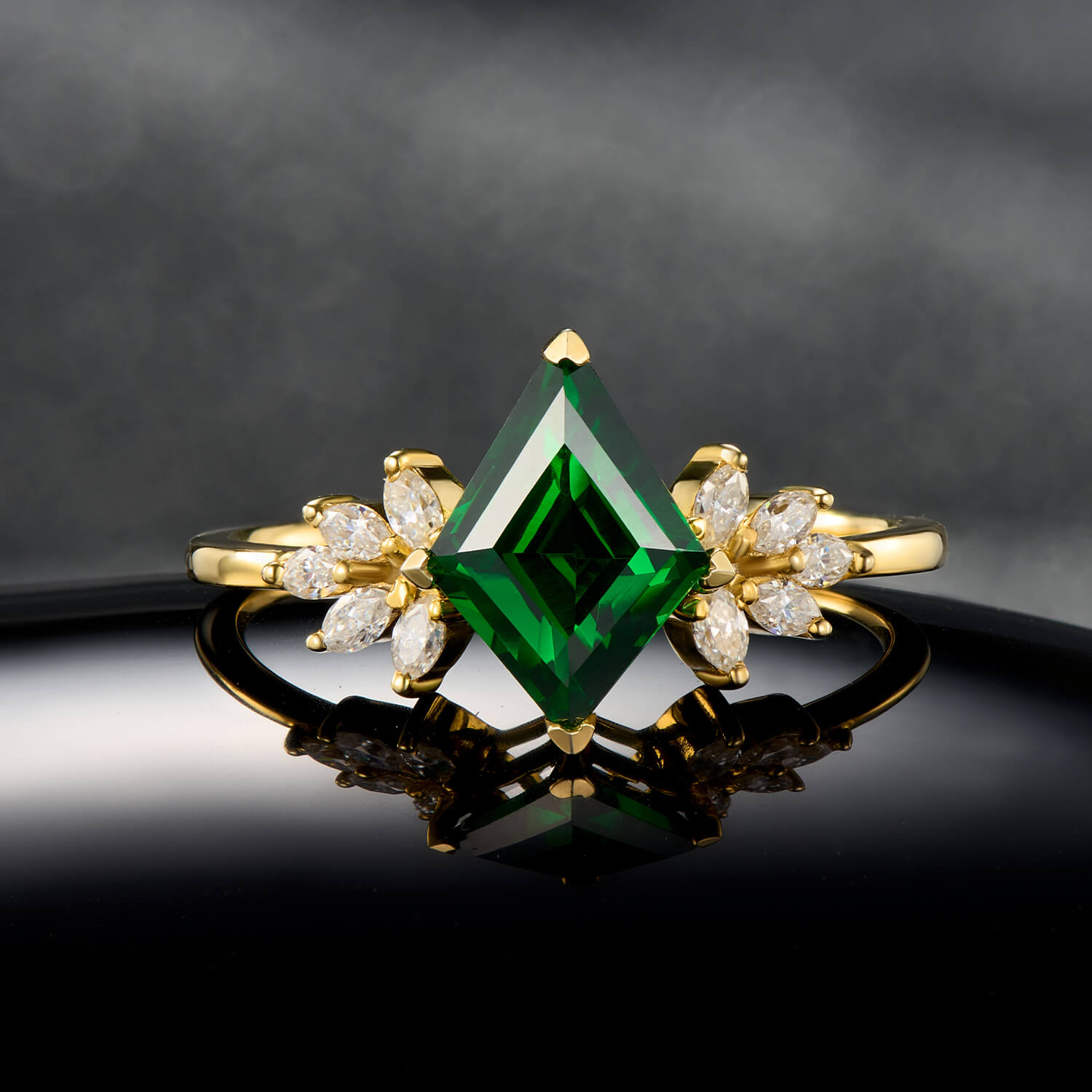 Bold in shape yet refined in design, this Elegant Kite Cut Emerald Ring showcases the rich, verdant beauty of emerald gemstones with delicate nature-inspired accents. Crafted in luminous gold, the ring blends classic elegance with subtle artistic detail, creating a piece that is both striking and wearable.
