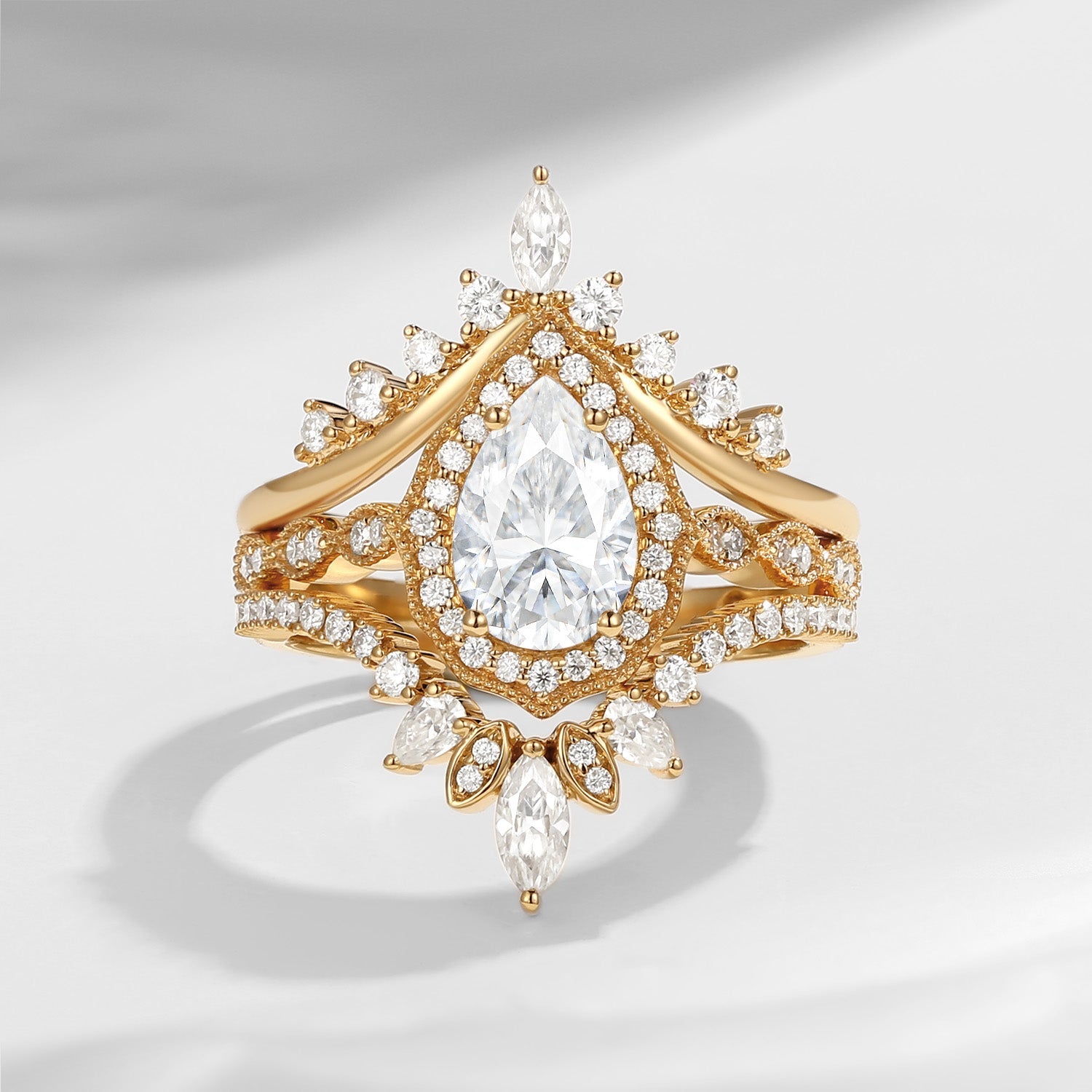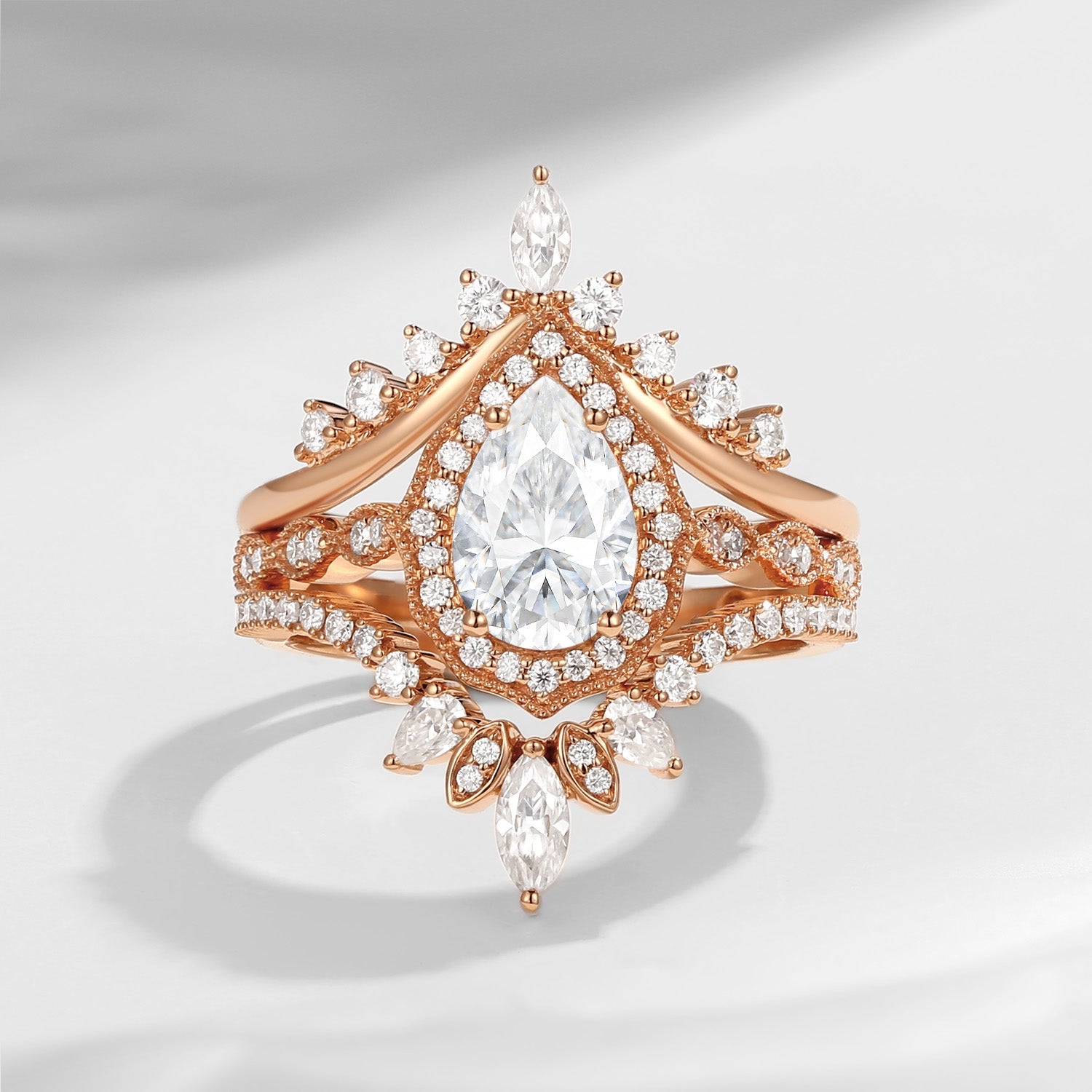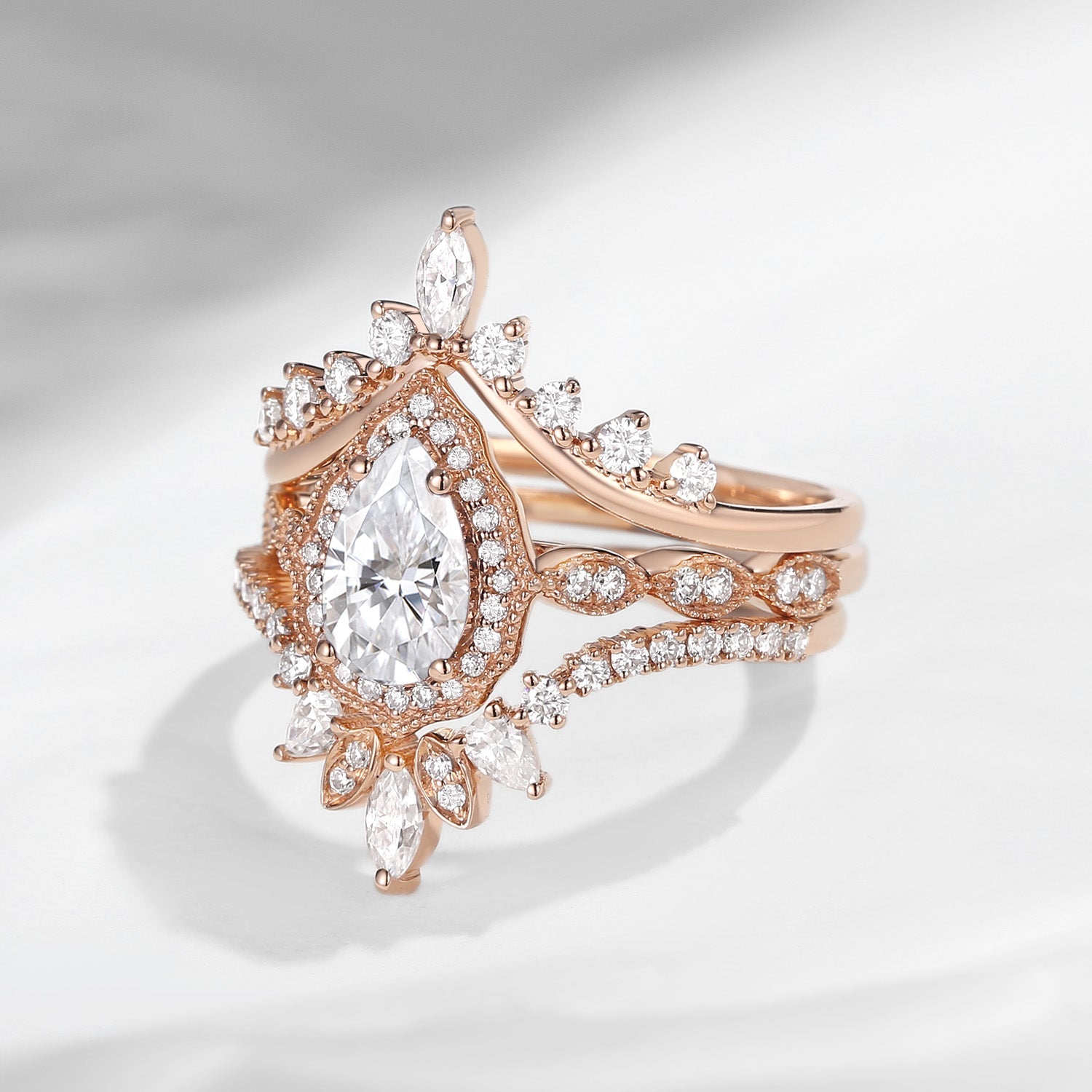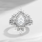 Vintage Inspired Pear Shaped Milgrain Moissanite Engagement Ring Set 3pcs - Diva