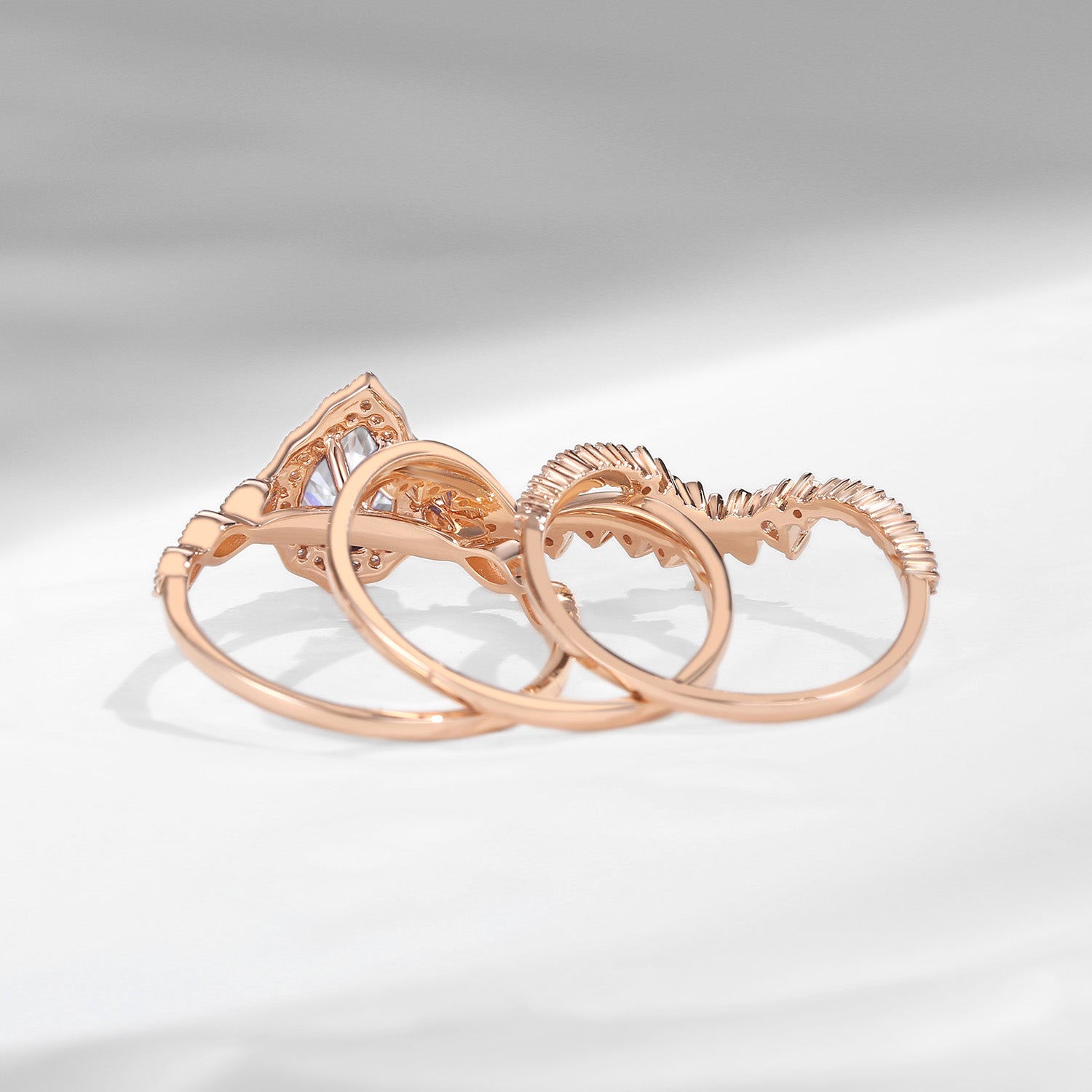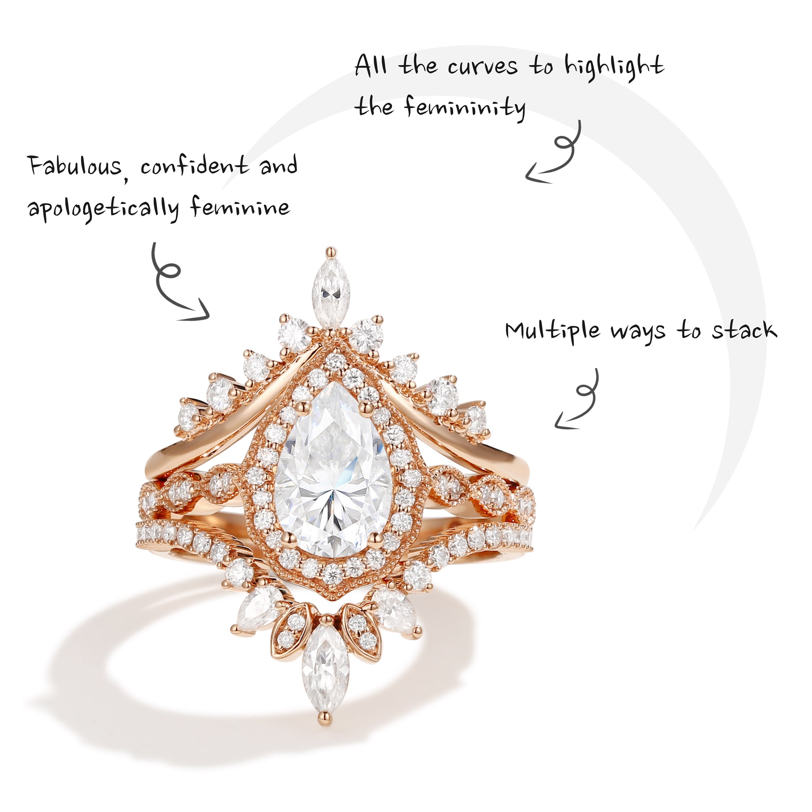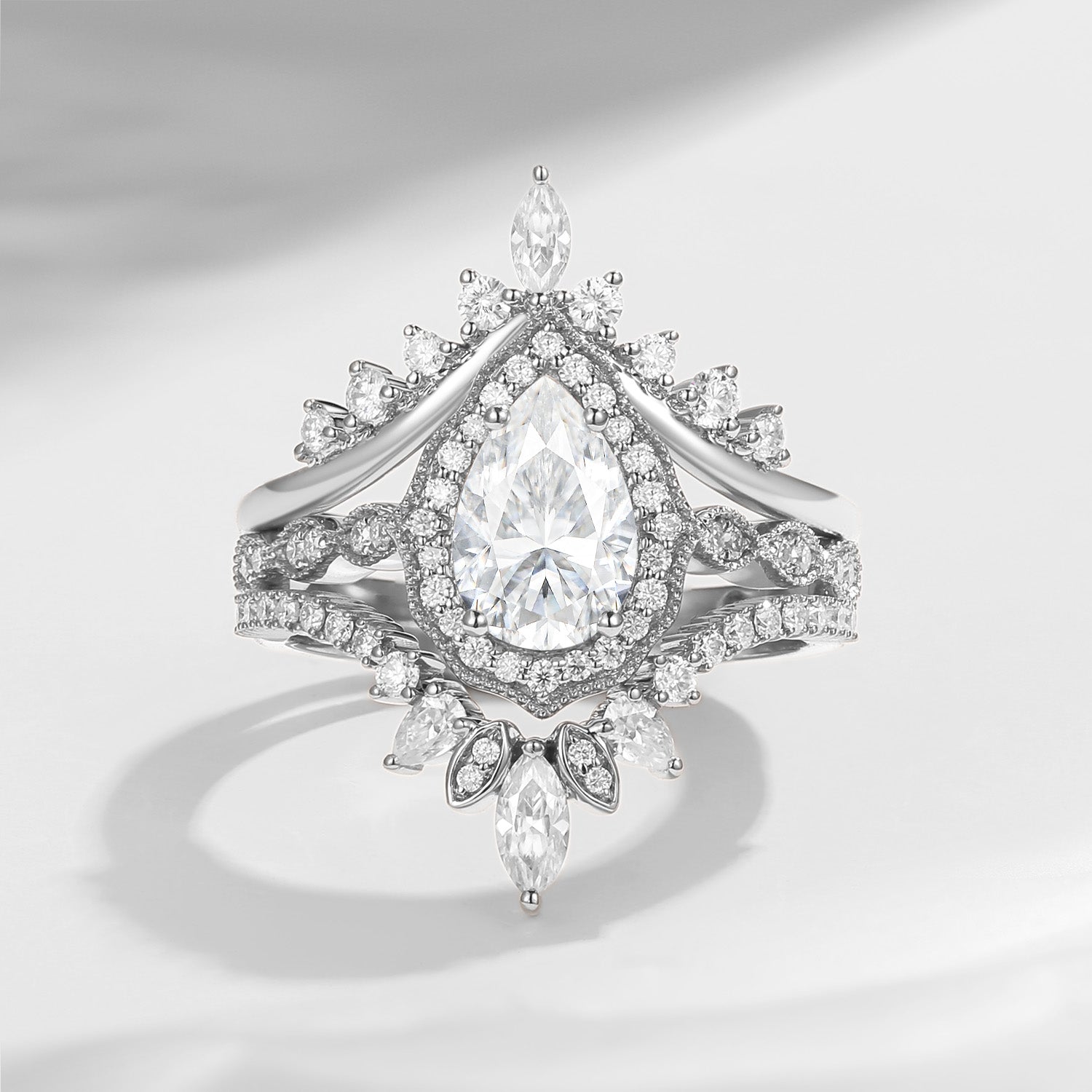 Vintage Inspired Pear Shaped Milgrain Moissanite Engagement Ring Set 3pcs - Diva