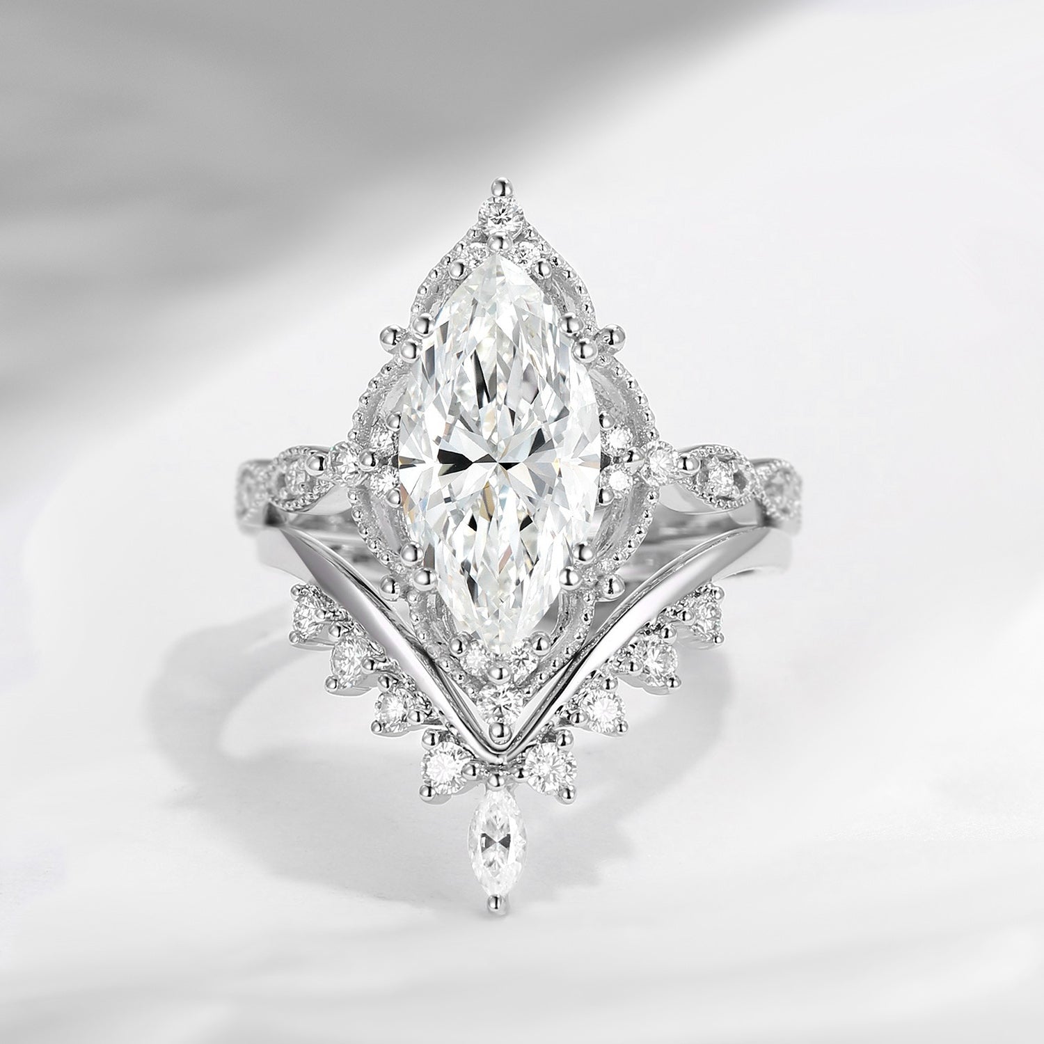 With its refined marquise centerpiece and perfectly matched bands, this vintage-inspired bridal set offers a timeless expression of love—elegant, romantic, and beautifully enduring.