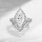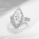 At the center sits a dazzling marquise cut moissanite, elongated to enhance finger length and brilliance. Its sharp points and elongated silhouette reflect light beautifully, creating a striking focal point with exceptional fire and clarity.