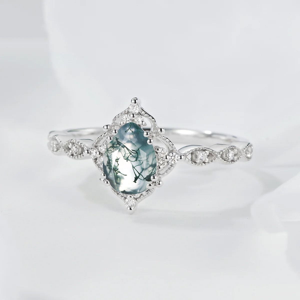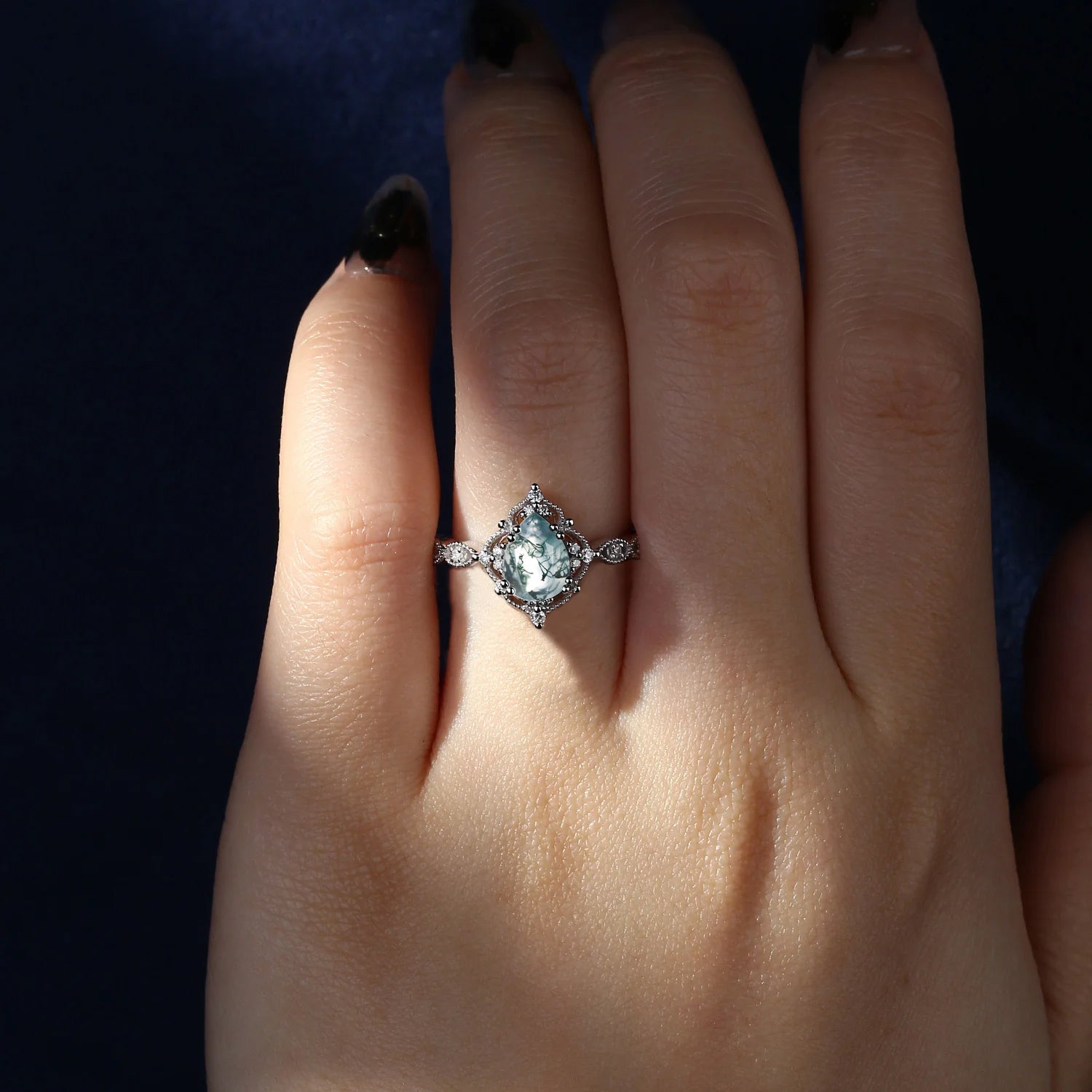 Vintage Pear Shaped Moss Agate Engagement Ring