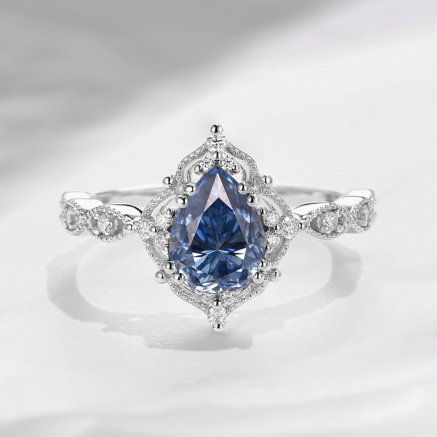 Vintage Pear Shaped Blue Moissanite Engagement Ring