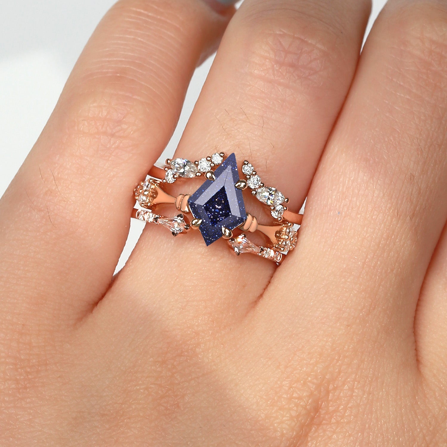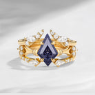 At its center lies a striking kite-cut blue sandstone, shimmering with deep midnight blue tones and subtle star-like sparkles that evoke a starlit sky. The elongated geometric silhouette creates a bold focal point, while surrounding accent stones add brilliance and balance to the overall design.